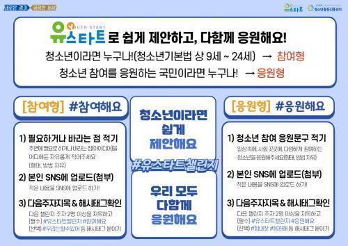 Âü¿© ¹æ¹ýÀº û¼Ò³âÀº ÁÖº¯¿¡ ÇÊ¿ä·Î Çϰųª ¹Ù¶ó´Â Á¡À» ÀûÀ¸¸é µÇ°í, û¼Ò³â Âü¿©¸¦ ÀÀ¿øÇÏ´Â ±¹¹ÎÀº û¼Ò³â Âü¿©¸¦ ÀÀ¿øÇÏ´Â ¹®±¸¸¦ Àû°í »çÁøÀ̳ª µ¿¿µ»ó µîÀ» Âï¾î º»ÀÎ SNS¿¡ ÷ºÎÇϰí, 縰Áö¸¦ À̾ 2¸í ÀÌ»óÀ» Áö¸ñÇÏ¿©, ÇØ½Ãű׸¦ ´Þ¸é ¡°À¯½ºÅ¸Æ®Ã§¸°Áö, Âü¿©ÇØ¿ä, ÀÀ¿øÇؿ䡱 µî Âü¿©°¡ ¿Ï·áµÈ´Ù.
