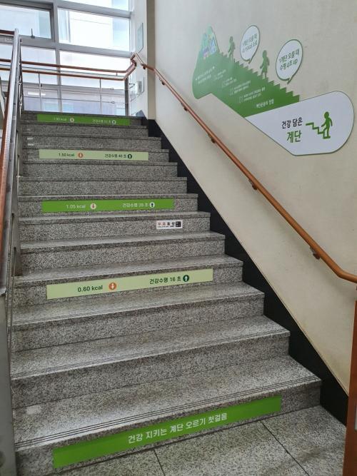 1ÃþºÎÅÍ 3Ãþ±îÁö °è´Ü°È±â¸¦ ÇÒ ¶§ ¼Ò¸ðµÇ´Â Ä®·Î¸® ¾ç µîÀ» ÀûÀº ½ºÆ¼Ä¿¿Í ¿¤¸®º£ÀÌÅÍ ÀÌ¿ë ´ë½Å °è´Ü°È±â¸¦ À¯µµÇÏ´Â ¾È³» ¹®±¸¸¦ °è´Ü°ú º®¸é¿¡ ºÎÂøÇß´Ù.