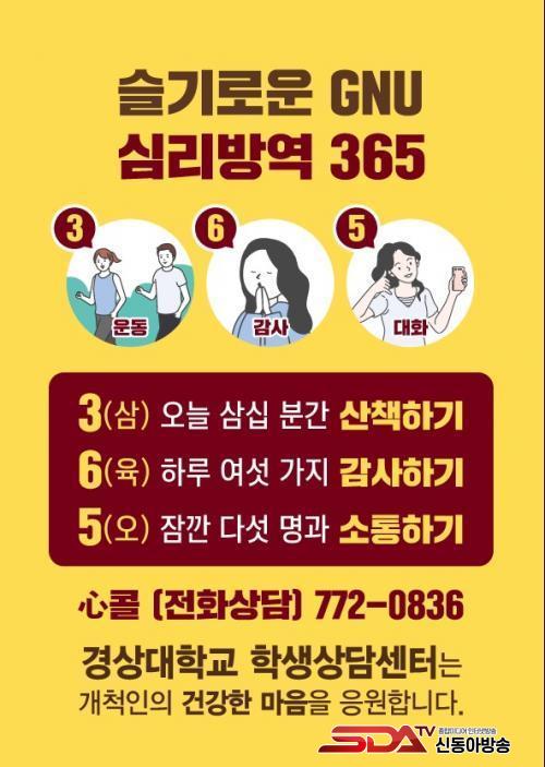 °æ»ó´ëÇб³ Çлý»ó´ã¼¾ÅÍ(¼¾ÅÍÀå ±èÀåȸ ±³À°Çаú ±³¼ö)´Â Á¤½Å °Ç°¿¡ ÇʼöÀûÀ̸鼵µ Àϻ󿡼 ½±°Ô ½ÇõÇÒ ¼ö ÀÖ´Â ¼¼ °¡Áö¸¦ ¼±Á¤ÇÏ¿© ¡®½½±â·Î¿î GNU ½É¸®¹æ¿ª 365¡¯ ¿îµ¿À» Àü°³ÇÑ´Ù.