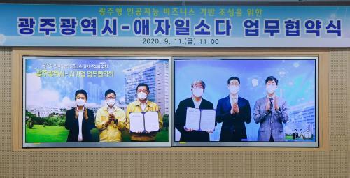 [½Åµ¿¾Æ¹æ¼Û=°­¼º´ë ±âÀÚ] À̿뼷 ±¤ÁÖ±¤¿ª½ÃÀåÀÌ ÃÖ±Ù ½Ãû ¿µ»óȸÀǽǿ¡¼­ (ÁÖ)¾ÖÀÚÀϼҴ٠ÃÖ´ë¿ì ´ëÇ¥¿Í ºñ´ë¸é ¿µ»óÀ» ÅëÇØ ÀΰøÁö´É ºñÁî´Ï½º ±â¹Ý Á¶¼ºÀ» À§ÇÑ ¾÷¹«Çù¾àÀ» ü°áÇÑ µÚ ±â³äÃÔ¿µÀ» Çϰí ÀÖ´Ù.