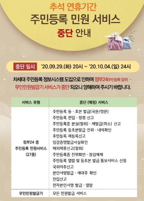 ´Ù¸¸, Ãß¼® ¿¬ÈÞ µ¿¾È ½Ã½ºÅÛ Àüȯ ÀÛ¾÷À» ½Ç½ÃÇÔ¿¡ µû¶ó ÀÌ ±â°£(9¿ù 29ÀÏ ~ 10¿ù 4ÀÏ)µ¿¾È Áֹεî·Ï µî¡¤Ãʺ» µî Áֹεî·Ï °ü·Ã ¼ºñ½º°¡ Àü¸é ÁߴܵȴÙ.