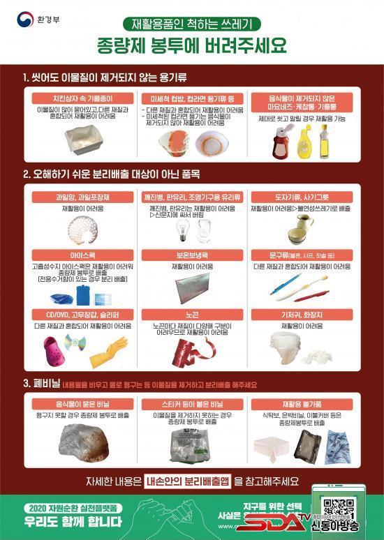 °°Àº ÀçÁúÀ̾ ÀçȰ¿ëÀÌ ¾È µÇ´Â ǰ¸ñµµ ¸¹´Ù. ¿µ¼öÁõ, ÅÃ¹è ¼ÛÀå, À¯±¤ ÄÚÆÃµÈ Àü´ÜÁö µîÀº ÀçȰ¿ëÀÌ ¾È µÇ¸ç, ¼±¹°¼¼Æ®¿ë ºÎÁ÷Æ÷ °¡¹æ, ³Ã¸ÅÁ¦, º¸Àڱ⠵ ÀçȰ¿ë ǰ¸ñ¿¡ ³Ö¾î¼´Â ¾È µÈ´Ù. À̵é ǰ¸ñÀº Áý¿¡¼ Á÷Á¢ ´Ù¸¥ ¿ëµµ·Î Àç»ç¿ëÇϰųª Á¾·®Á¦ ºÀÅõ¿¡ ³Ö¾î ÀÏ¹Ý ¾²·¹±â·Î ¹èÃâÇØ¾ß ÇÑ´Ù. ÀÌ·¯ÇÑ, ºÐ¸®¹èÃâ ¹æ¹ýÀº ¡®³» ¼Õ¾ÈÀÇ ºÐ¸®¹èÃ⡯¾Û¿¡¼ ¼Õ½±°Ô È®ÀÎÇÒ ¼ö ÀÖ´Ù.