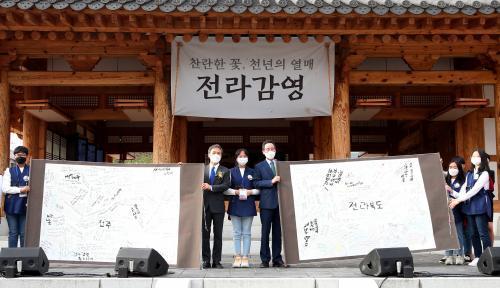 [½Åµ¿¾Æ¹æ¼Û=°­¼º´ë ±âÀÚ] Àü¶ó°¨¿µ ÀçâÁ¶ º¹¿ø ±â³ä½ÄÀÌ Áö³­ 7ÀÏ ¿­¸° °¡¿îµ¥ ¼ÛÇÏÁø ÀüºÏµµÁö»ç¿Í ±è¿µ·Ï Àü³²µµÁö»ç, ±è½Â¼ö ÀüÁÖ½ÃÀåÀ» ºñ·ÔÇÑ Âü¼®ÀÚµéÀÌ ÇöÆÇ Á¦¸·½ÄÀ» °®°í ÀÖ´Ù.