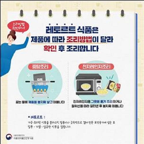 ¶ÇÇÑ ÁNī·¹, °£ÆíÁ×, ±¹¹ä µîÀÇ ·¹Å丣Ʈ ½ÄǰÀº Á¦Ç°ÀÇ Á¾·ù¿¡ µû¶ó Á¶¸®¹æ¹ýÀÌ ´Ù¸£¹Ç·Î ¡®ÁßÅÁ¿ë¡¯ÀÎÁö ¡®ÀüÀÚ·¹ÀÎÁö¿ë¡¯ÀÎÁö È®ÀÎÇØ¾ß Çϸç ÀüÀÚ·¹ÀÎÁö¸¦ »ç¿ëÇÒ °æ¿ì, Àü¿ë¿ë±â¿¡ ¿Å°Ü Á¶¸®Çϰųª ÀýÃë¼±À» µû¶ó Àß¶ó³½ ÈÄ µ¥¿ì°í, ¼¼¿ï ¼ö ÀÖ´Â ÆÄ¿ìÄ¡ ÇüÅÂÀÇ Á¦Ç°Àº ¹Ø¸éÀ» ³Ð°Ô Æì¼ ¾²·¯ÁöÁö ¾Êµµ·Ï ÇØ¾ß ÇÑ´Ù.