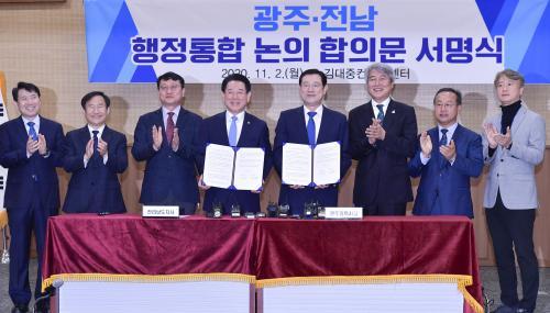 [½Åµ¿¾Æ¹æ¼Û=°¼º´ë ±âÀÚ] À̿뼷 ±¤ÁÖ±¤¿ª½ÃÀå°ú ±è¿µ·Ï Àü³²µµÁö»ç°¡ 2ÀÏ ¿ÀÀü ¼±¸ ±è´ëÁßÄÁº¥¼Ç¼¾ÅÍ¿¡¼ ±¤ÁÖ¡¤Àü³² ÇàÁ¤ÅëÇÕ ³íÀÇ ÇÕÀǹ®¿¡ ¼¸íÇÑ µÚ Âü¼®ÀÚµé°ú ÇÔ²² ±â³äÃÔ¿µÀ» Çϰí ÀÖ´Ù.
