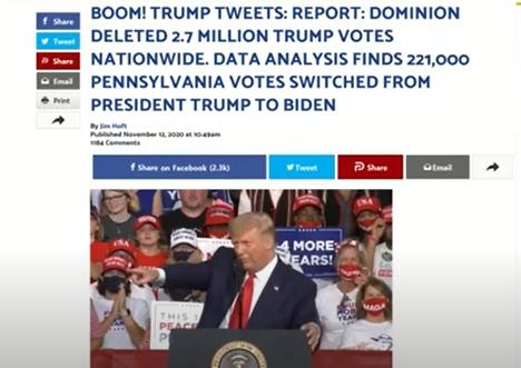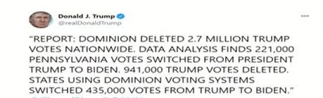 Æ®·³ÇÁ ´ëÅë·ÉÀÌ Æ®À§ÅÍ¿¡ Á÷Á¢ ¾´ ¹®ÀåÀº ´ÙÀ½°ú °°´Ù. - ¡°REPORT: DOMINION DELETED 2.7 MILLION TRUMP VOTES NATIONWIDE. DATA ANALYSIS FINDS 221,000 PENNSYLVANIA VOTES SWITCHED FROM PRESIDENT TRUMP TO BIDEN. 941,000 TRUMP VOTES DELETED. STATES USING DOMINION VOTING SYSTEMS SWITCHED 435,000 VOTES FROM TRUMP TO BIDEN.¡±