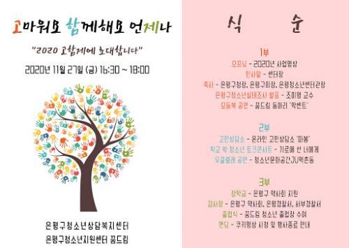 °íÇÔÁ¦´Â ¡®°í¸¶¿ö¿ä, ÇÔ²²ÇØ¿ä, ¾ðÁ¦³ª¡¯¶ó´Â Àǹ̸¦ Áö³æÀ¸¸ç, ÀºÆò±¸ ³» û¼Ò³â, ±³»ç, Çкθð, À¯°ü±â°ü ½Ç¹«ÀÚ µîÀÌ ÇÔ²² ÇÒ ¼ö ÀÖ´Â ÃàÁ¦ÀÇ ÀåÀÌ´Ù. Äڷγª19·Î ÀÎÇØ µÎ ¼¾ÅͰ¡ °øµ¿À¸·Î ¿î¿µÇÏ´Â À¯Æ©ºê ä³Î(ÀºÆò±¸Ã»¼Ò³â»ó´ãº¹Áö¼¾ÅÍ&²Þµå¸²)À» ÅëÇØ ½Ç½Ã°£ ½ºÆ®¸®¹ÖÀ¸·Î °³ÃֵȴÙ.