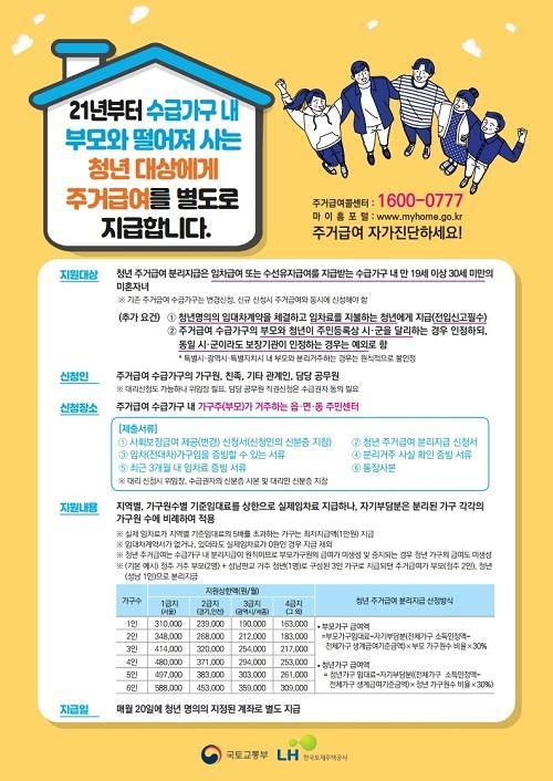 ½Ã´Â ³»³â 1¿ù 1ÀϺÎÅÍ ½ÃÇàµÇ´Â û³â Áְű޿© ºÐ¸®Áö±ÞÀ» ¾ÕµÎ°í 12¿ù 1ÀϺÎÅÍ »çÀü½ÅûÀ» ¹Þ´Â´Ù. ½Åû´ë»óÀº ÁßÀ§¼Òµæ 45% ÀÌÇÏÀÎ Áְű޿© ¼ö±ÞÀÚ Áß ÃëÇС¤±¸Á÷ µîÀ» ¸ñÀûÀ¸·Î ºÎ¸ð¿Í Áֹεî·Ï»ó ½Ã±ºÀ» ´Þ¸®ÇÏ¿© °ÅÁÖÇÏ´Â ¸¸ 19¼¼ ÀÌ»ó ¸¸ 30¼¼ ¹Ì¸¸ ¹ÌÈ¥ û³âÀÌ´Ù.
