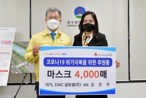 [½Åµ¿¾Æ¹æ¼Û=°­¼º´ë ±âÀÚ] ±¤ÁÖ±¤¿ª½Ã ¼­±¸´Â Áö³­ 9ÀÏ EMC ±Û·Î¹ú ±èÀºÁÖ ´ëÇ¥°¡ ¼­±¸ ³ó¼º2µ¿ Áֹμ¾ÅÍ¿¡ Äڷγª19 ±Øº¹À» À§ÇÑ KF94¸¶½ºÅ© 4000ÀåÀ» ±âºÎÇß´Ù°í 10ÀÏ ¹àÇû´Ù.