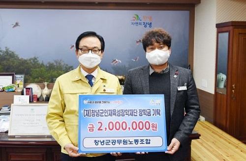 23ÀÏ Ã¢³ç±º¿¡ µû¸£¸é °ø¹«¿ø³ëµ¿Á¶ÇÕÀÌ (Àç)â³ç±ºÀÎÀçÀ°¼ºÀåÇÐÀç´ÜÀ» ¹æ¹®ÇØ Áö¿ªÀÇ ÀÎÀçÀ°¼ºÀ» À§ÇÑ ÀåÇÐ±Ý 200¸¸¿øÀ» Àü´ÞÇß´Ù°í ¹àÇû´Ù.
