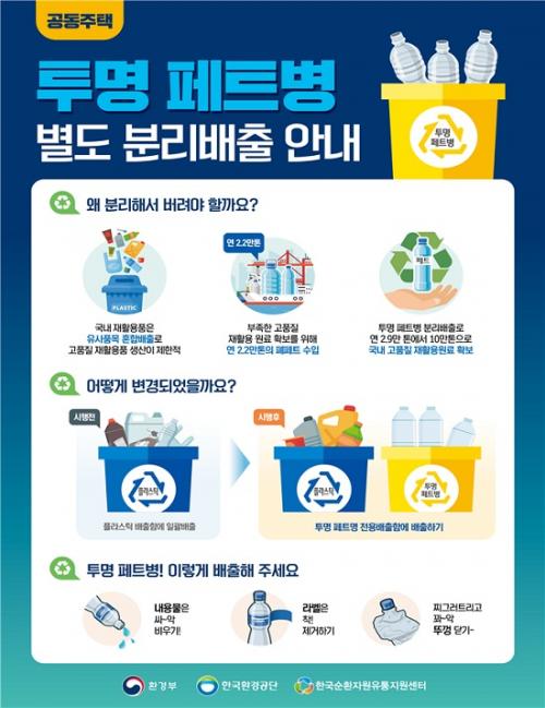 ÀÌ¿¡ µû¶ó °øµ¿ÁÖÅà °ü¸®»ç¹«¼Ò¿¡¼´Â ±âÁ¸ ÇÃ¶ó½ºÆ½ ¹èÃâÇÔ°ú ±¸ºÐµÇ´Â º°µµ Åõ¸í ÆäÆ®º´ Àü¿ë ¹èÃâÇÔÀ» ¸¶·ÃÇØ¾ß ÇÑ´Ù. ºÐ¸® ¹èÃâµÈ Åõ¸í ÆäÆ®º´Àº ÀçȰ¿ë ¾÷ü¿¡¼ ¼±º°°ú Àç»ý¿ø·á ó¸® °úÁ¤À» °ÅÃÄ ±â´É¼º ÀÇ·ù, °¡¹æ µî¿¡ ¾²ÀÌ´Â ÀÇ·ù¿ë ¿ø»ç·Î ¸¸µé¾îÁö°Å³ª Àç»ý ¿ë±â·Î Àç»ý»êµÈ´Ù.