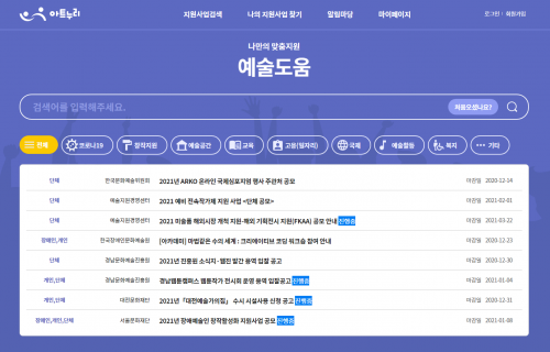 ¾ÕÀ¸·Î ¿¹¼úÀεéÀº ¡®¾ÆÆ®´©¸®¡¯¿¡¼­ Á¦°øÇÏ´Â Áö¿ª¡¤´ë»ó¡¤¿¹¼úºÐ¾ßº° µî Æí¸®ÇÑ ¿¹¼úÁö¿ø»ç¾÷ Á¤º¸ °Ë»ö, Ȱµ¿Áö¿ª¡¤°ü½ÉºÐ¾ßº° ¸ÂÃãÇü Áö¿ø»ç¾÷ Ãßõ, īī¿ÀÅåÀ̳ª ÀüÀÚ¿ìÆíÀ¸·Î Áö¿ø»ç¾÷ ½Åû ¸¶°¨ÀÏ ¾Ë¸², ÀüÀÚ¿ìÆíÀ¸·Î »ç¾÷ ¹®ÀÇ µîÀ» ÅëÇØ ¾î·Á¿òÀ» ÇØ°áÇÒ ¼ö ÀÖ´Ù. ƯÈ÷ Ȱµ¿Áö¿ª, °ü½É ¿¹¼ú ºÐ¾ß µîÀÇ °³ÀÎÁ¤º¸¸¦ ¡®¾ÆÆ®´©¸®¡¯¿¡ ¹Ì¸® ÀÔ·ÂÇϸé ÀÌ¿¡ ¸Â´Â Áö¿ø»ç¾÷ °ø°í°¡ °Ô½ÃµÆÀ» ¶§ īī¿ÀÅåÀ̳ª ÀüÀÚ¿ìÆíÀ¸·Î ¾È³»¹ÞÀ» ¼ö ÀÖ´Ù.