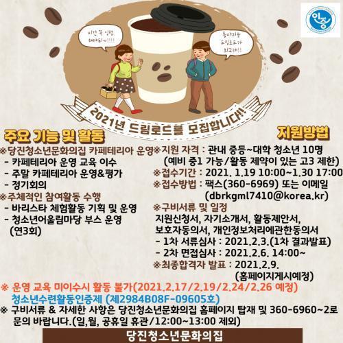 2016³â 1±â ¿î¿µÀ» ½ÃÀÛÀ¸·Î Ä«ÆäÅ׸®¾Æ ¿î¿µ µ¿¾Æ¸® µå¸²·Îµå¸¦ ¿î¿µ ÁßÀÎ ´çÁøÃ»¼Ò³â¹®ÈÀÇÁýÀº ´çÁø½Ã û¼Ò³â(ÁßÇлý~´ëÇлý)À» ´ë»óÀ¸·Î ½Å±Ô ´Ü¿øÀ» ¸ðÁý ÇÒ ¿¹Á¤ÀÌ´Ù.
