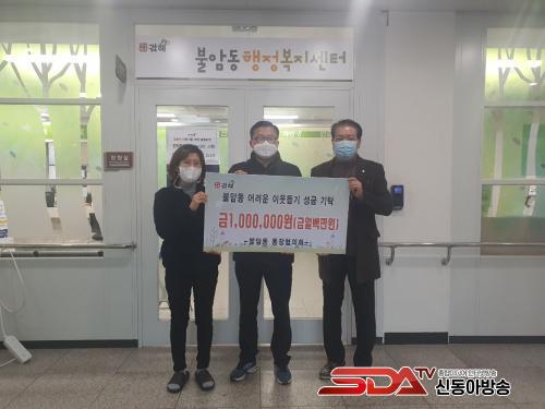 [½Åµ¿¾Æ¹æ¼Û=¼ÛÇöÁÖ ±âÀÚ] ºÒ¾Ïµ¿ ÅëÀåÇùÀÇȸ(ȸÀå Ç㿵µ·)´Â 18ÀÏ ºÒ¾Ïµ¿ ÇàÁ¤º¹Áö¼¾Å͸¦ ¹æ¹®ÇÏ¿© °ü³» Àú¼ÒµæÃþ¿¡°Ô ÀüÇØ´Þ¶ó¸ç Çö±Ý 100¸¸¿øÀ» ±âŹÇß´Ù.