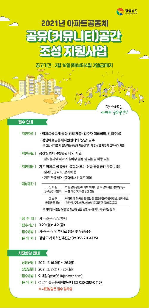 µÎ »ç¾÷ ¸ðµÎ °æ³²¸¶À»°øµ¿Ã¼Áö¿ø¼¾ÅÍÀÇ »çÀü »ç¾÷»ó´ãÀ» ¹Þ¾Æ¾ß Çϸç, °øµ¿Ã¼È°µ¿Áö¿ø Áֹΰø¸ð»ç¾÷Àº 3¿ù 16ÀϱîÁö, ¾ÆÆÄÆ®°øµ¿Ã¼ °øÀ¯°ø°£ Á¶¼º Áö¿ø»ç¾÷Àº 4¿ù 2ÀϱîÁö °ÅÁÖÁö ½Ã±º¿¡ »ç¾÷Á¦¾È¼¸¦ Á¢¼öÇÏ¸é µÈ´Ù.