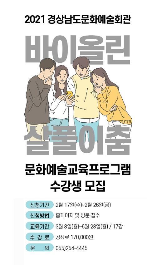 [½Åµ¿¾Æ¹æ¼Û=À±Çý¸² ±âÀÚ] °æ»ó³²µµ¹®È­¿¹¼úȸ°ü(°üÀå °­µ¿¿Á)ÀÌ ¿À´Â 17ÀϺÎÅÍ 26ÀϱîÁö 2021³â ¹®È­¿¹¼ú±³À° ¼ö°­»ýÀ» ¸ðÁýÇÑ´Ù.