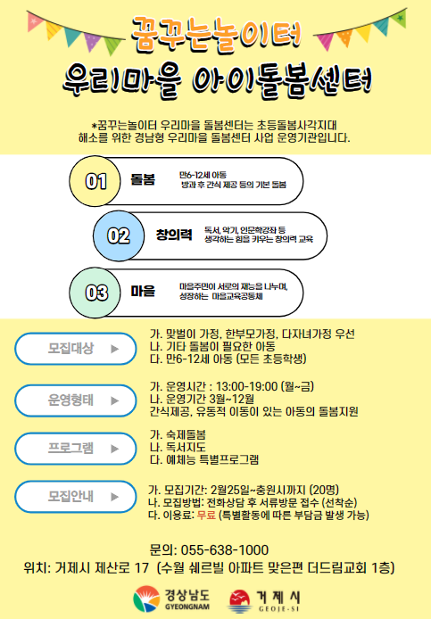 ¸ðÁý´ë»óÀº ¸Â¹úÀÌ °¡Á¤ µî µ¹º½ÀÌ ÇÊ¿äÇÑ ¸¸6¼¼~12¼¼ ¾Æµ¿À¸·Î ÀÌ¿ë·á´Â ¹«·á´Ù. ¿î¿µ½Ã°£Àº ÆòÀÏ(¿ù~±Ý)13:00~19:00±îÁö·Î ¾Æµ¿µéÀÇ ¼÷Á¦, µ¶¼Áöµµ, ¿¹Ã¼´É Ưº°ÇÁ·Î±×·¥ ¿î¿µ°ú °£½ÄÀÌ Á¦°øµÇ°í À¯µ¿Àû(Çпø µî) À̵¿ÀÌ ÀÖ´Â ¾Æµ¿ÀÇ µ¹º½À» Áö¿øÇÑ´Ù.