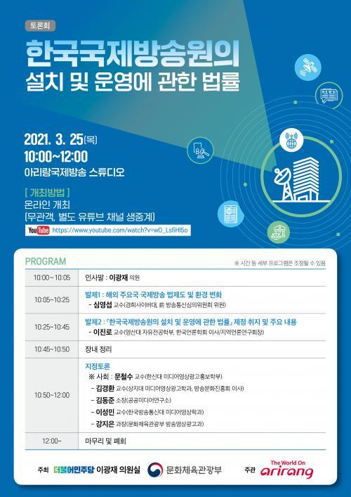 [½Åµ¿¾Æ¹æ¼Û=¾ÈÀº°æ ±âÀÚ] ¹®È­Ã¼À°°ü±¤ºÎ(Àå°ü ȲÈñ)´Â ±¹È¸ À̱¤Àç(±âȹÀçÁ¤À§¿øÈ¸) ÀÇ¿ø½Ç°ú ÇÔ²² 「Çѱ¹±¹Á¦¹æ¼Û¿øÀÇ ¼³Ä¡ ¹× ¿î¿µ¿¡ °üÇÑ ¹ý·ü」À» ³íÀÇÇϰí ÇöÀå ÀǰßÀ» ûÃëÇϱâ À§ÇÑ Åä·Ðȸ¸¦ 3¿ù 25ÀÏ(¸ñ) ¿ÀÀü 10½Ã¿¡ °³ÃÖÇÑ´Ù. À̹ø Åä·Ðȸ´Â Äڷγª19 È®»ê ¹æÁö¸¦ À§ÇØ Ã»Áß ¾øÀÌ ¿Â¶óÀÎÀ¸·Î ÁøÇàÇϸç, ±¹Á¦¹æ¼Û±³·ùÀç´Ü(¾Æ¸®¶ûTV) À¯Æ©ºê ä³ÎÀ» ÅëÇØ »ýÁß°èÇÑ´Ù.