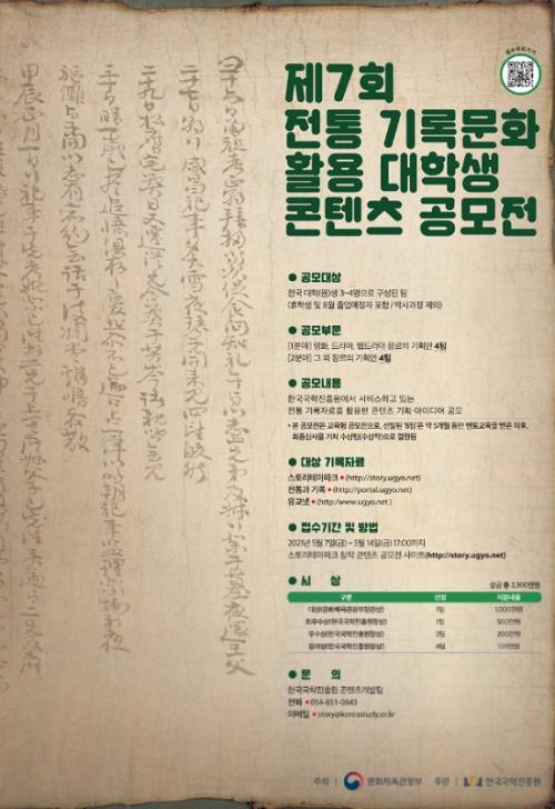 ¹®ÈüÀ°°ü±¤ºÎ(Àå°ü ȲÈñ)´Â °ú°Å¿Í ÇöÀ縦 À̾îÁÖ´Â ÀüÅë ±â·Ï¹®ÈÀÇ ¹«ÇÑÇÑ °¡´É¼º¿¡ Âø¾ÈÇØ Çѱ¹±¹ÇÐÁøÈï¿ø(¿øÀå Á¤Á¾¼·)°ú ÇÔ²² 5¿ù 7ÀÏ(±Ý)ºÎÅÍ 14ÀÏ(±Ý)±îÁö ¡®Á¦7ȸ ÀüÅë ±â·Ï¹®È Ȱ¿ë ´ëÇлý ÄÜÅÙÃ÷ °ø¸ðÀü(ºÎÁ¦: ½ºÅ丮Å׸¶ÆÄÅ© âÀÛ ÄÜÅÙÃ÷ °ø¸ðÀü)¡¯À» °³ÃÖÇÑ´Ù.