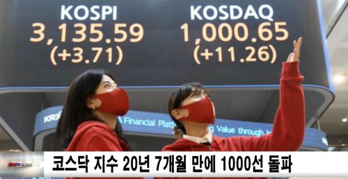 ÄÚ½º´ÚÁö¼ö°¡ Á¾°¡ ±âÁØÀ¸·Î 1,000¼±À» ¿ôµ· °ÍÀº Á¤º¸±â¼úÁÖ ºÕÀÌ ÀϾú´ø ½Ã±âÀÎ 2000³â 9¿ù 14ÀÏ ÀÌÈÄ 20³â 7°³¿ù¸¸ÀÔ´Ï´Ù.