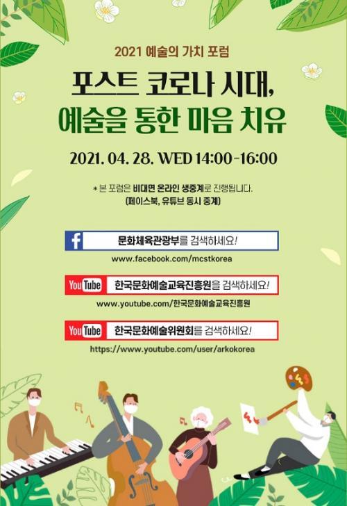 ¹®Ã¼ºÎ´Â Çѱ¹¹®È°ü±¤¿¬±¸¿ø°ú ÇÔ²², ¿¹¼úÀÇ »çȸÀû °¡Ä¡¿¡ ´ëÇÑ ´ã·ÐÀ» Çü¼ºÇϰí Á¤Ã¥À» °³¹ßÇϱâ À§ÇØ ¡®2021 ¿¹¼úÀÇ °¡Ä¡ Åä·Ðȸ(Æ÷·³)¡¯¸¦ ±âȹÇß´Ù. À̸¦ ÅëÇØ ¿ÃÇØ 4¿ù°ú 10¿ù µÎ Â÷·Ê¿¡ °ÉÃÄ °¢ ºÐ¾ß Àü¹®°¡µé°ú ÇÔ²² ¡®»çȸ¹®Á¦¸¦ ÇØ°áÇÒ ¼ö ÀÖ´Â ¿¹¼úÀÇ °¡Ä¡¡¯¿¡ ´ëÇØ ½Éµµ ÀÖ°Ô ³íÀÇÇÒ ¿¹Á¤ÀÌ´Ù.