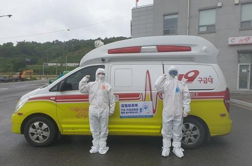 ÇöÀç Àü 119±¸±Þ´ë´Â Äڷγª·ÎºÎÅÍ ±¸±Þ´ë¿øÀ» º¸È£ÇÏ°í µµ¹ÎµéÀÇ ±³Â÷°¨¿°À» »çÀü¿¡ Â÷´ÜÇϱâ À§ÇØ ±¸±ÞÃ⵿ ½Ã ¡®Äڷγª19 °ü·Ã 119±¸±Þ´ë À̼ÛÁöħ¡¯¿¡ µû¶ó º¸È£º¹¡¤¸¶½ºÅ©¡¤°í±Û¡¤Àå°©¡¤µ¡½Å µî 5Á¾ÀÇ °¨¿°º¸È£º¹À» Âø¿ëÇϰí ÀÖ´Ù.