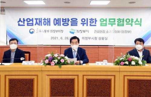 [½Åµ¿¾Æ¹æ¼Û=¾ÈÀº°æ ±âÀÚ] ÀÇÁ¤ºÎ½Ã(½ÃÀå ¾Èº´¿ë)´Â 6¿ù 28ÀÏ ½Ãû »óȲ½Ç¿¡¼­ ÀÇÁ¤ºÎÁö¿ª °Ç¼³ÇöÀå »ê¾÷ÀçÇØ ¿¹¹æÀ» À§ÇÑ »óÈ£ Çù·Â ¹æ¾ÈÀ» ³»¿ëÀ¸·Î °í¿ë³ëµ¿ºÎ ÀÇÁ¤ºÎÁöû, ÀÇÁ¤ºÎÁö¿ª °Ç¼³ÇöÀå ¼ÒÀåÇùÀÇü¿Í ¾÷¹«Çù¾àÀ» ü°áÇß´Ù.