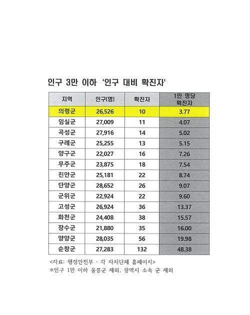 Àü±¹ 14°³ Áö¹æÀÇ ¡®Àα¸ 1¸¸ ¸í´ç È®ÁøÀÚ¡¯¸¦ 12ÀÏ ¿ÀÈÄ 15½Ã ±âÁØÀ¸·Î »ìÆìºÃ´Ù. ÀÇ·ÉÀº Àα¸ 2¸¸6õ¿© ¸íÀ¸·Î ÇöÀç ´©Àû È®ÁøÀÚ 10¸íÀ» ³ªÅ¸³»°í ÀÖ´Ù. À̸¦ ¡®Àα¸ 1¸¸ ¸í´ç È®ÁøÀÚ¡¯·Î ȯ»êÇÏ¸é ¡®3.7¸í¡¯ÀÌ´Ù. ÀÌ´Â Àα¸ 3¸¸ ÀÌÇÏ ÀÚÄ¡´Üü °¡¿îµ¥ °¡Àå ³·Àº ¼öÄ¡´Ù. Àα¸¼ö°¡ ºñ½ÁÇÑ ¼øÃ¢±º°ú´Â ¹«·Á 10¹è ÀÌ»ó Â÷À̰¡ ³´Ù.