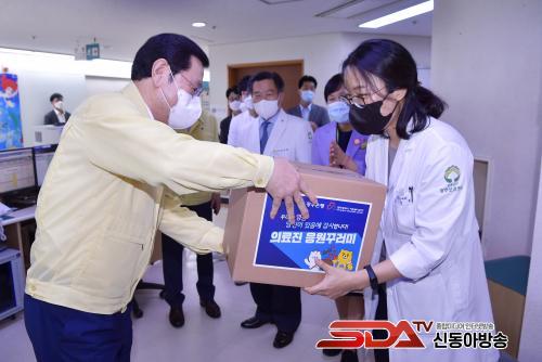 ¸ÕÀú À̿뼷 ½ÃÀå°ú ½Ã °£ºÎµéÀº 18ÀÏ ¿ÀÈÄ °¨¿°º´ Àü´ãº´¿øÀÎ º¸Èƺ´¿ø°ú ÀÏ°î ¼±º°Áø·á¼Ò µî 10°³ ±â°üÀ» Â÷·Ê·Î ¹æ¹®ÇØ 600¸í(ÀÇ»ç 117, °£È£»ç 228, ¹æ¿ªÁ¾»çÀÚ 255¸í)ÀÇ ¹æ¿ª Á¾»çÀÚ¿¡°Ô ½Ã¹ÎµéÀÇ ÀÀ¿øÇÏ´Â ¸¶À½À» ´ãÀº °¨»çÀåÀ» Àü´ÞÇß´Ù. ¶Ç ±¤ÁÖÀºÇà¿¡¼ ÈÄ¿øÇÑ °Ý·Á ²Ù·¯¹Ìµµ Á¦°øµÆ´Ù.