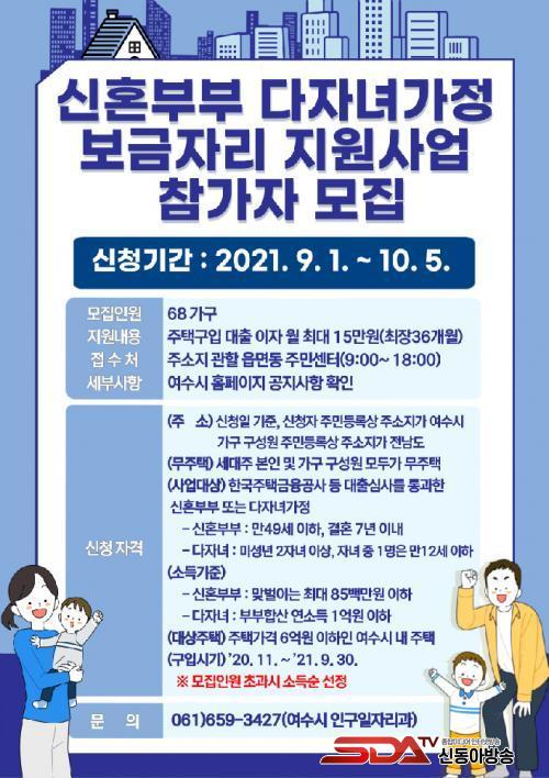 ½Åû ÀÚ°ÝÀº ¿©¼ö½Ã¿¡ °ÅÁÖÇÏ´Â ¹«ÁÖÅà ½ÅÈ¥ºÎºÎ(°áÈ¥ 7³â ÀÌÇÏ, ºÎºÎ ¸ðµÎ ¸¸ 49¼¼ ÀÌÇÏ) ¶Ç´Â ´ÙÀڳడÁ¤(¹Ì¼º³â ÀÚ³à 2¸í ÀÌ»óÀ̸ç 1¸íÀº ¸¸12¼¼ ÀÌÇÏ)À¸·Î, Çѱ¹ÁÖÅñÝÀ¶°ø»ç µîÀÇ ´ëÃâ½É»ç¸¦ Åë°úÇØ 2020³â 11¿ùºÎÅÍ 2021³â 9¿ù¿¡ ¿©¼ö½Ã ³»¿¡ ½Å±Ô·Î ÁÖÅÃÀ» ±¸ÀÔÇÑ ¼¼´ëÀÌ´Ù.