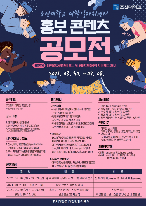 À̹ø È«º¸ÄÜÅÙÃ÷ °ø¸ðÀüÀº Á¶¼±´ëÇб³ ´ëÇÐÀÏÀÚ¸®¼¾ÅÍ ¼Ò°³ ¹× ¿ªÇÒ, ÇÁ·Î±×·¥ ¾È³» ¹× È«º¸¿Í û³â°í¿ëÁ¤Ã¥ Áö¿øÁ¦µµ È«º¸·Î µÎ °¡Áö ÁÖÁ¦¸¦ ´Ù·é´Ù.