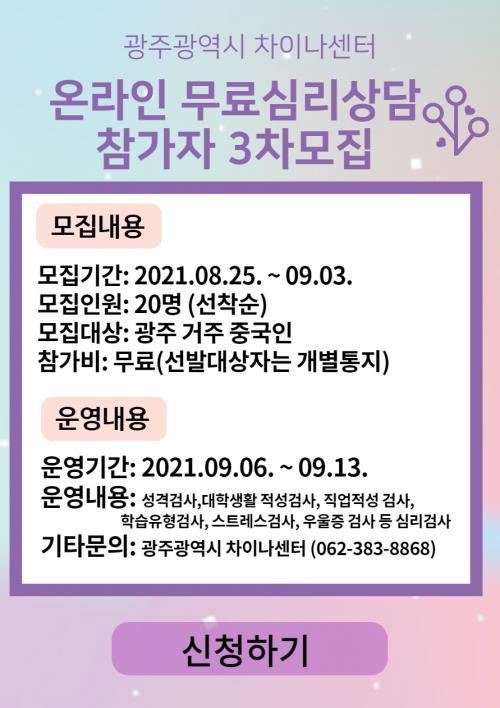 ã¾Æ°¡´Â »ó´ã¼¾ÅÍ 3Â÷ ½É¸®°Ë»ç ÇÁ·Î±×·¥Àº 20¸íÀ» ¼±Âø¼ø ¸ðÁýÇϸç, Â÷À̳ª¼¾ÅÍ È¨ÆäÀÌÁö(www.gwangjucfc.kr)¸¦ ÅëÇØ ½ÅûÇÏ¸é µÈ´Ù. ¼±¹ßµÈ ´ë»óÀÚ´Â ¿Â¶óÀÎ ½É¸®°Ë»ç¸¦ ÅëÇØ °á°ú ºÐ¼® ÈÄ 1:1 »ó´ãµµ ¹ÞÀ» ¼ö ÀÖ´Ù.