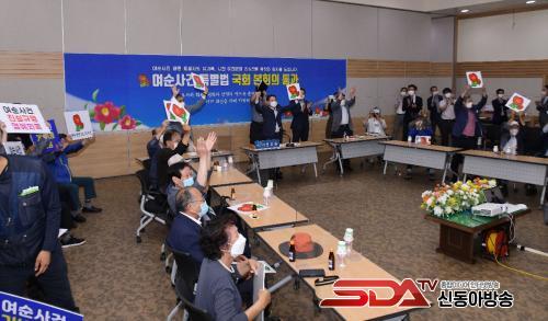 »çÁø=Áö³­ 6¿ù 29ÀÏ ¿ÀÈÄ 2½Ã 50ºÐ ¿©¼ö½Ãû ȸÀǽǿ¡¼­ ±Ç¿ÀºÀ ¿©¼ö½ÃÀå°ú ¿©¼ø»ç°Ç ¿©¼ö À¯Á·È¸, ½Ã¹Î ÃßÁøÀ§¿øÈ¸, ½Ãû Á÷¿øµéÀÌ Çѵ¥ ¸ð¿© ¿©¼ø»ç°Ç Ưº°¹ý ±¹È¸ º»È¸ÀÇ Åë°ú Àå¸éÀ» º¸¸ç ȯȣÇϰí ÀÖ´Ù.