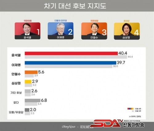 ¸®¾ó¹ÌÅͰ¡ ¿À¸¶ÀÌ´º½º ÀÇ·Ú·Î Áö³ 19ÀϺÎÅÍ 24ÀϱîÁö Àü±¹ 18¼¼ ÀÌ»ó 3090¸íÀ» ´ë»óÀ¸·Î ½Ç½ÃÇÑ ¿©·ÐÁ¶»ç °á°ú¿¡ µû¸£¸é, À± Èĺ¸ ÁöÁöÀ²Àº 40.4%, ÀÌ È帴 39.7%·Î ³ªÅ¸³µ´Ù.