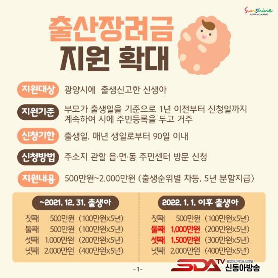 ½Ã´Â ±âÁ¸ ù°~µÑ°¾Æ¿¡ 500¸¸ ¿ø, ¼Â°¾Æ¿¡ 1,000¸¸ ¿ø, ³Ý°¾Æ ÀÌ»óºÎÅÍ 2,000¸¸ ¿øÀÇ Ãâ»êÀå·Á±ÝÀ» Áö¿øÇϰí ÀÖÀ¸³ª, 2022³â 1¿ù 1ÀÏ ÀÌÈÄ Ãâ»ýÇÑ ½Å»ý¾ÆºÎÅÍ´Â µÑ°¾Æ 1,000¸¸ ¿ø, ¼Â°¾Æ 1,500¸¸ ¿øÀ¸·Î È®´ë Áö¿øÇÑ´Ù.
