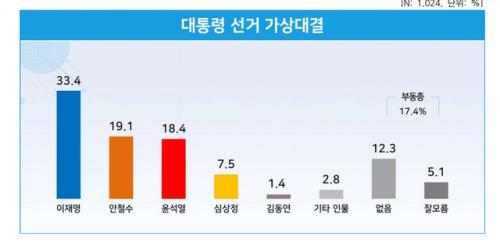 ¿©·ÐÁ¶»ç±â°ü ¸®¾ó¹ÌÅͰ¡ YTN ÀÇ·Ú·Î Áö³ 3~4ÀϱîÁö ÀÌÆ²°£ Àü±¹ ¸¸ 18¼¼ºÎÅÍ 39¼¼ ³²³à 1024¸íÀ» ´ë»óÀ¸·Î Á¶»çÇÑ °á°ú ÀÌ Èĺ¸ 33.4%, ¾È Èĺ¸ 19.1%, À± Èĺ¸ 18.4%·Î ³ªÅ¸³µ´Ù.