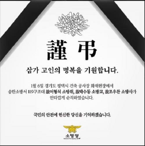 [½Åµ¿¾Æ¹æ¼Û=¹Ú´ë¿µ ±âÀÚ]ÆòÅà ½ÅÃà°ø»çÀå ÈÀçÁø¾Ð µµÁß ºÒÀÇÀÇ »ç°í·Î ¼øÁ÷ÇÑ Íº ÀÌÇü¼® ¼Ò¹æ°æ(50), ͺ ¹Ú¼öµ¿ ¼Ò¹æÀå(31), ͺ Á¶¿ìÂù ¼Ò¹æ±³(25)ÀÇ ÇÕµ¿¿µ°á½ÄÀÌ 8ÀÏ ¿ÀÀü 9½Ã 30ºÐ ÆòÅà ÀÌÃæ¹®ÈüÀ°¼¾ÅÍ¿¡¼ °æ±âµµÃ»Àå(ÌÈѲԳôæí÷)À¸·Î °ÅÇàµÈ´Ù.