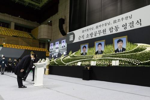 ÀÌ¾î ¡°¼¼ ºÐÀÇ Çå½Å°ú Èñ»ý¿¡ ±íÀº Á¸°æÀÇ ¸¶À½À» ¹ÙÄ¡¸ç, À¯°¡Á· ¿©·¯ºÐ²²¼ ½½ÇÄÀ» µó°í ´Ù½Ã ÀÏ¾î¼½Ç ¼ö ÀÖµµ·Ï ³¡±îÁö ÇÔ²² Çϰڴ١±¸ç ¡°±×µ¿¾È ÁøÇàÇß´ø ¾ÈÀü°ü¸® ³ë·Â¿¡µµ ºÒ±¸ÇÏ°í ¶Ç´Ù½Ã ÀÏ¾î³ ¼Ò¹æ°üÀÇ Èñ»ý ¾Õ¿¡ ¸¶À½ÀÌ ¹«³ÊÁø´Ù. µµÁ¤ Ã¥ÀÓÀڷμ ºñÅëÇÏ°í ¼Û±¸½º·¯¿ï µû¸§¡±À̶ó°í ¾ÈŸ±î¿òÀ» Ç¥Çß´Ù.