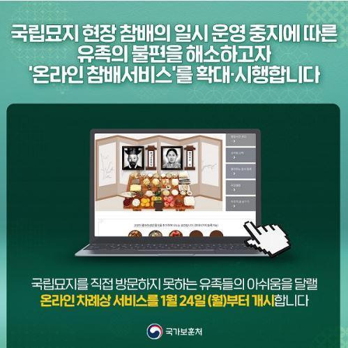 ±¹°¡º¸ÈÆÃ³´Â ¼³ ¿¬ÈÞ ±â°£ÀÎ 1¿ù 29ÀϺÎÅÍ 2¿ù 2ÀϱîÁö ÇöÃæ¿ø, È£±¹¿ø µî Àü±¹ 12°³ ±¹¸³¹¦ÁöÀÇ ÇöÀå Âü¹è ´ë½Å ¡®¿Â¶óÀÎ Âü¹è¼ºñ½º¡¯·Î ´ëüÇϰí, À̸¦ È®´ë ¿î¿µÇÑ´Ù°í 21ÀÏ ¹àÇû´Ù.