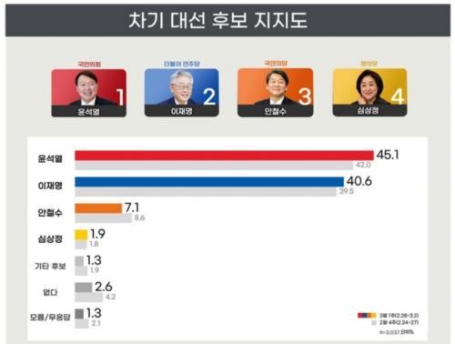 ¿©·ÐÁ¶»ç Àü¹®±â°ü ¸®¾ó¹ÌÅͰ¡ ¿À¸¶ÀÌ´º½ºÀÇ ÀÇ·Ú·Î Áö³´Þ 28ÀϺÎÅÍ 3¿ù 2ÀϱîÁö ÁøÇàµÈ Â÷±â ´ë¼±Èĺ¸ ÁöÁöµµ Á¶»ç °á°ú À±¼®¿ 45.1%, ÀÌÀç¸í 40.6%·Î ³ªÅ¸³µ´Ù.
