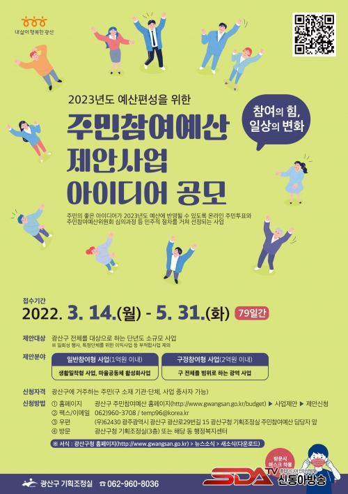 Á¦¾È»ç¾÷ ½Åû¼´Â ±¤»ê±¸ ÁÖ¹ÎÂü¿©¿¹»ê ´©¸®Áý(https://www.gwangsan.go.kr/budget/) ¶Ç´Â µ¿ ÇàÁ¤º¹Áö¼¾ÅÍ, ±¤»ê±¸ ±âȹÁ¶Á¤½Ç ¹æ¹® ȤÀº ¿ìÆí(¿ìÆí¹øÈ£ 62430 ±¤ÁÖ ±¤»ê±¸ ±¤»ê·Î29¹ø±æ 15 ±¤»ê±¸Ã» ±âȹÁ¶Á¤½Ç ÁÖ¹ÎÂü¿©¿¹»ê ´ã´çÀÚ ¾Õ) ¹× ÆÑ½º(062-960-3708)·Î Á¢¼öÇÑ´Ù.