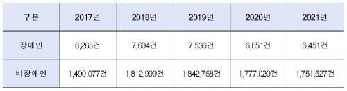 Àå¾ÖÀÎÀÌ ¿îÀü¸éÇã½ÃÇè¿¡ Á¢¼öÇÏ´Â °Ç¼ö´Â ¡â2017³â 6,265°Ç, ¡â2018³â 7,604°Ç, ¡â2019³â 7,536°Ç, ¡â2020³â 6,651°Ç, ¡â2021³â 6,451°ÇÀ¸·Î ¸Å³â 6õ °Ç ÀÌ»óÀÌ´Ù.