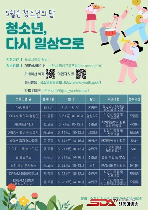 ¼øÃµ½Ã û¼Ò³â¼ö·Ã°üÀº ¡ã5¿ù 3ÀϺÎÅÍ ¡®Ã»¼Ò³âÀÌ ¹Ù¶ó´Â ¼øÃµ¡¯À» ÁÖÁ¦·Î ÇÑ SNS Ä·ÆäÀÎ ¡ã5¿ù 7ÀÏ ¾î¹öÀ̳¯ ¸ÂÀÌ Ä«³×ÀÌ¼Ç ¾×ÀÚ ¸¸µé±â ¹× »ç¶ûÀÇ ÆíÁö¾²±â Ȱµ¿ ¡ã5¿ù 14ÀÏ¡¤28ÀÏ Áݱë(ºÀÈ»ê, µ¿Ãµ) ºÀ»çȰµ¿ ¡ã5¿ù 21ÀÏ ÈÞ(ýÌ)ÇÁ·ÎÁ§Æ® ¡ã5¿ù 21ÀÏ À̸éÁö¸¦ Ȱ¿ëÇÑ ³ëÆ® ¸¸µé±â(ºÏ¹ÙÀεù) Ȱµ¿ ¡ã5¿ù 6ÀÏ¡¤14ÀÏ¡¤28ÀÏ Áø·ÎÁ÷¾÷(°æÂû°ü, °£È£»ç, ±³»ç, ºäƼµðÀÚÀ̳Ê) Ȱµ¿ µîÀ» ÁøÇàÇÑ´Ù.
