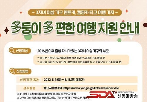 Áö¿ø ´ë»óÀº 2016³â ÀÌÈÄ Ãâ»ýÇÑ ÀÚ³à 1¸í ÀÌ»ó°ú °°ÀÌ ½Ã¿¡ °ÅÁÖÇϰí ÀÖ´Â 3ÀÚ³à ÀÌ»ó °¡±¸ÀÇ ºÎ¸ðÀ̰í, ½Ã ÅëÇÕ¿¹¾à ȨÆäÀÌÁö(https://www.yongin.go.kr/resve/index.do)¿¡¼­ 7Àν ÀÌ»ó ÀÚµ¿Â÷¿Í Ä·Çοë ÀÚµ¿Â÷ Áß Çϳª¸¦ ¼±ÅÃÇØ ½ÅûÇÏ¸é µÈ´Ù. 1Â÷ Áö¿ø ¼±Á¤ °¡±¸´Â Á¦¿ÜµÈ´Ù.