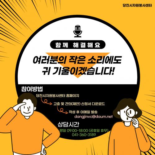 ÀÚ¿øºÀ»ç Ȱµ¿À» ÇÏ¸é¼ °íÃæ ¹× °ÇÀÇÇÒ »çÇ×ÀÌ ÀÖ´Â °æ¿ì, ´çÁø½ÃÀÚ¿øºÀ»ç¼¾ÅÍ È¨ÆäÀÌÁö(http://www.dangjinvc.co.kr) ÀÚ·á½Ç¿¡ °Ô½ÃµÇ¾î ÀÖ´Â ¾ç½Ä Áß ¡®°íÃæ ¹× °ÇÀÇ ½Åû¼¡¯¸¦ ³»·Á¹Þ¾Æ ÀÛ¼ºÇÑ ÈÄ ¼¾ÅÍ À̸ÞÀÏ(dangjinvc@daum.net)·Î ¹ß¼ÛÇϸé 14ÀÏ À̳»¿¡ ó¸® °á°ú¸¦ ¹Þ¾Æ º¼ ¼ö ÀÖ´Ù.