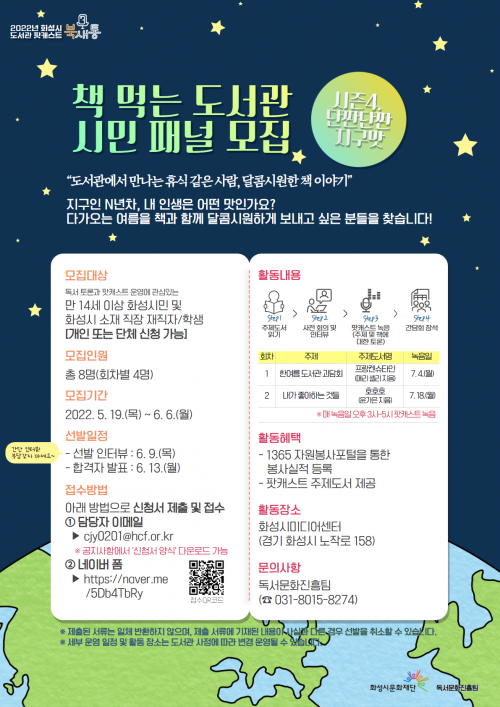 À̹ø¿¡ ¸ðÁýÇÏ´Â ½Ã¹Î ÆÐ³ÎÀº ¡®ºÏ»õÅë ½ÃÁð4 ´Ü§´Ü§ Áö±¸¸À¡¯¿¡ Âü°¡ÇÏ¿© ¡®ÇÑ¿©¸§ µµ¼°ü ±«´ãȸ¡¯, ¡®³»°¡ ÁÁ¾ÆÇÏ´Â °Íµé¡¯ À̶ó´Â ÁÖÁ¦ÀÇ ºÏÅäÅ© ÄÜÅÙÃ÷¸¦ ÇÔ²² Á¦ÀÛÇÏ°Ô µÈ´Ù. ȸÂ÷º° 4¸í¾¿ ÃÑ 8¸íÀ» ¸ðÁýÇϸç, ÀÎÅÍºä °úÁ¤À» °ÅÃÄ ÃÖÁ¾ ¼±Á¤ÇÑ´Ù. ½Ã¹Î ÆÐ³Î·Î Ȱµ¿ ½Ã, ÆÌij½ºÆ® ÁÖÁ¦ µµ¼¿Í ºÀ»çȰµ¿ ½Ã°£À» Á¦°øÇÑ´Ù.