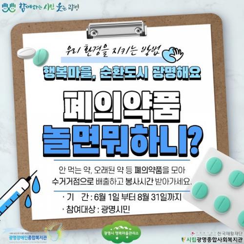 ¡¸ÆóÀǾàǰ ³î¸é ¹¹ÇÏ´Ï?¡¹´Â ±¤¸í½Ã¹ÎÀ» ´ë»óÀ¸·Î °¡Á¤¿¡¼ ¹æÄ¡µÇ¾î À߸ø ¹ö·ÁÁø ÆóÀǾàǰÀÇ È¯°æ¿À¿° À§Ç輺À» ¾Ë¸®°í ¿Ã¹Ù¸¥ ÆóÀǾàǰ ºÐ¸®¹èÃâ ¹æ¹ý¿¡ ´ëÇØ ¹è¿ì¸ç ÆóÀǾàǰ ¼ö°Å¿¡ Âü¿©ÇÏ´Â Ä·ÆäÀÎÀÌ´Ù. Âü¿©ÀÚ¿¡°Ô´Â ±¤¸í½Ã ÀÚ¿øºÀ»ç¼¾ÅÍ¿Í ¿¬°èÇØ ÀÚ¿øºÀ»ç ½Ã°£µµ ºÎ¿©µÈ´Ù.