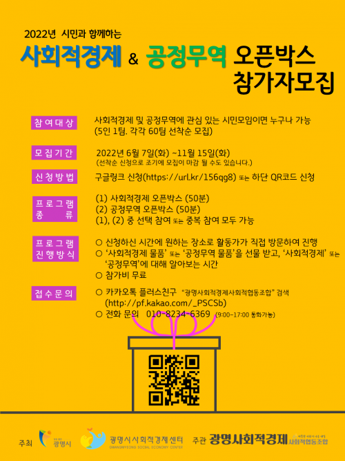 ÁֹΠ¸ðÀÓ, Çлý, Á÷ÀåÀÎ µî »çȸÀû°æÁ¦¿Í °øÁ¤¹«¿ª¿¡ °ü½ÉÀÌ ÀÖ´Â ±¤¸í½Ã¹ÎÀ̶ó¸é ´©±¸³ª Âü¿© °¡´ÉÇϸç, ±¤¸í½Ãû ´©¸®Áý(gm.go.kr) ¶Ç´Â Âü°¡ ½Åû ¸µÅ©, QR ÄÚµå µîÀ» ÅëÇØ ½ÅûÇÒ ¼ö ÀÖ´Ù. 11¿ù 15ÀϱîÁö »çȸÀû°æÁ¦ ¿Àǹڽº¿Í °øÁ¤¹«¿ª ¿Àǹڽº °¢ 60ÆÀ¾¿(5ÀÎ 1ÆÀ)À» ¸ðÁýÇÏ¿© ÃÑ 600¸íÀÇ ½Ã¹ÎÀ» ¸¸³¯ ¿¹Á¤ÀÌ´Ù.
