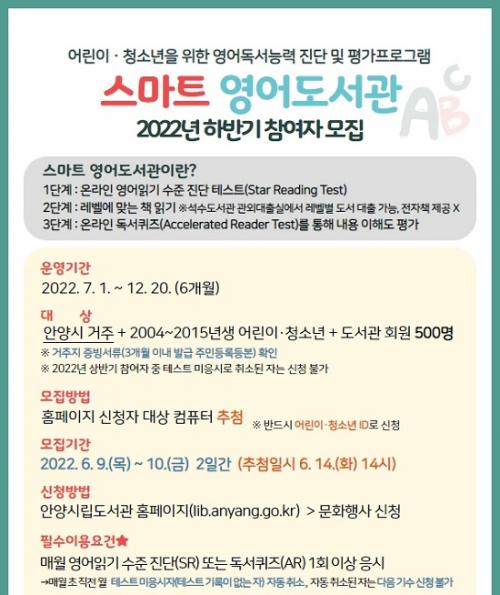 ÇϹݱ⠡¸½º¸¶Æ® ¿µ¾îµµ¼°ü¡¹¿î¿µ ±â°£Àº 7¿ùºÎÅÍ 12¿ù±îÁöÀ̸ç, ½Åû ´ë»óÀº Áֹεî·Ï»ó ¾È¾ç½Ã °ÅÁÖÀÚÀÌ¸é¼ ¾È¾ç½Ã µµ¼°ü ȸ¿øÀÎ ¾î¸°ÀÌ ¹× û¼Ò³â(2004~2015³â»ý) 500¸íÀÌ´Ù.