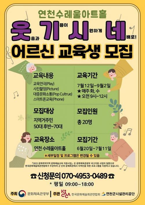 ¿¬Ãµ¼ö·¹¿ï¾ÆÆ®È¦Àº Æ÷õ½Ã¸³±Ø´Ü°ú ÇÔ²² ¡®¿ô±â½Ã³×!¡¯ ÇÁ·Î±×·¥À» ÁøÇàÇÏ°Ô µÆ´Ù. ¡®¿ô±â½Ã³×!¡¯ ±³À°ÇÁ·Î±×·¥Àº ¿ôÀ½°ú ±â»ÝÀÌ ½Ã¿øÇÏ°Ô ³×¹è·ÎÀÇ ÁÙÀÓ¸»ÀÌ´Ù. ¿¬±Ø(Play), »çÁø(Picture), ´ëÁß¹®È(Pop culture), ½º¸¶Æ®Æù(Phone) P·Î ½ÃÀÛÇÏ´Â 4°¡Áö ¼ÒÀ縦 ¿ì¸®ÀÇ »ý¾ÖÁֱ⿡ ¸ÂÃá ±³À°°ú ¿¬°èÇØ ¾Æµ¿±âºÎÅÍ ³ë³â±â±îÁö ÀÚ½ÅÀÇ ÀλýÀ» µ¹¾Æº¸°í ¹Ì·¡¸¦ ¼³°èÇÒ ¼ö ÀÖµµ·Ï ¸¶·ÃµÈ ±³À°ÀÌ´Ù. ¸ðµç »ý¾ÖÁֱ⸦ üÇèÇÏ°í ¸¶Áö¸· ¼º°ú ¹ßǥȸ¸¦ ÅëÇØ ³ª¸¸ÀÇ Àλý ¹«Áö°³¸¦ ¿Ï¼ºÇÑ´Ù.